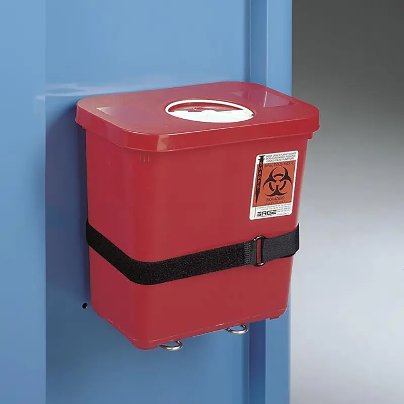 Secures sharps container to a wall or med cart by maintaining the container upright throughout use