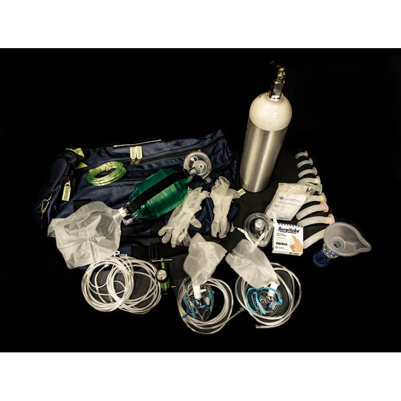 Oxygen cylinder with regulator, airway kit, mask tubing, and carry bag